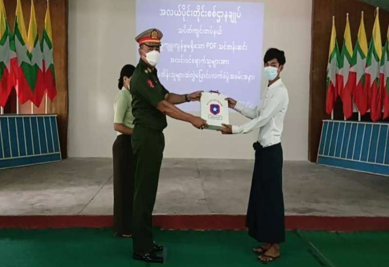 တိုင်းရင်းသားလက်နက်ကိုင်အဖွဲ့နယ်မြေအတွင်း သင်တန်းများတက်ရောက်ခဲ့ပြီး ပြစ်မှုကျူးလွန်ခြင်းမရှိခဲ့သည့် ဥပဒေဘောင်အတွင်း ဝင်ရောက်လာသော မန္တလေးတိုင်းဒေသကြီး၊ စဉ့်ကူးမြို့နယ်နှင့် မတ္တရာမြို့နယ်တို့မှ PDF အဖွဲ့ဝင်များအား ၎င်း၏ မိဘအုပ်ထိန်းသူများထံသို့ ထပ်မံလွှဲပြောင်းပေးအပ်ခြင်းကို ယနေ့တွင် စဉ့်ကူးမြို့နယ် စီမံအုပ်ချုပ်ရေးကောင်စီရုံး၌ ပြုလုပ်ရာ အလယ်ပိုင်းတိုင်းစစ်ဌာနချုပ်၊ သပိတ်ကျင်းတပ်နယ်မှ တပ်နယ်မှူး ဗိုလ်မှူးချုပ် အောင်အောင်နှင့် မြို့နယ်စီမံအုပ်ချုပ်ရေးအဖွဲ့မှ တာဝန်ရှိသူများ၊ ဥပဒေဘောင်အတွင်း ဝင်ရောက်လာသူများနှင့် ၎င်းတို့၏ မိဘအုပ်ထိန်းသူများ တက်ရောက်ကြသည်။