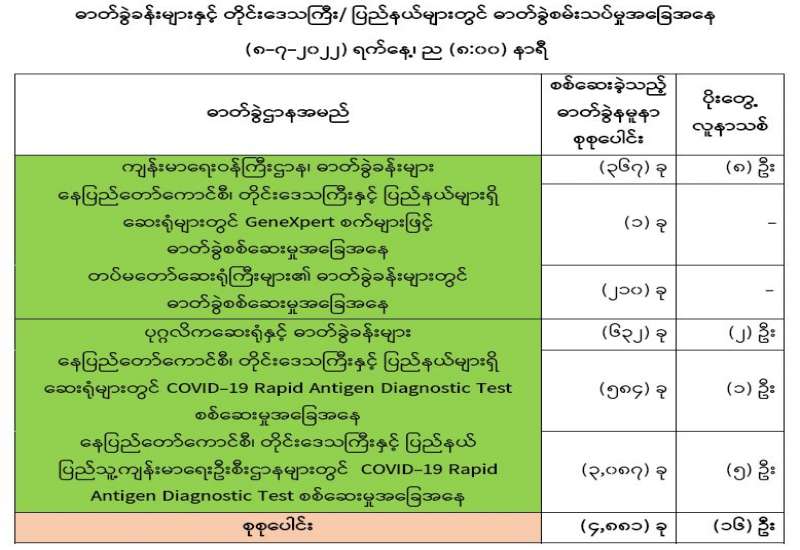 ကျန်းမာရေးဝန်ကြီးဌာနအနေဖြင့် နိုင်ငံအတွင်း ကူးစက်ဖြစ်ပွားနေသော COVID-19 ရောဂါ ကာကွယ်၊ ကုသ၊ ထိန်းချုပ်ရေးလုပ်ငန်းများကို အရှိန်အဟုန်မပြတ် ဆောင်ရွက်လျက်ရှိပါသည်။