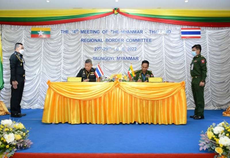 မြန်မာနိုင်ငံက အိမ်ရှင်အဖြစ်လက်ခံကျင်းပပြုလုပ်သည့် (၃၄)ကြိမ်မြောက် မြန်မာ-ထိုင်း ဒေသဆိုင်ရာ နယ်ခြားကော်မတီအစည်းအဝေး ဒုတိယနေ့ကို ယနေ့နံနက်ပိုင်းတွင် တောင်ကြီးမြို့ရှိ တောင်ကြီးဟိုတယ်၌ ဆက်လက်ကျင်းပရာ မြန်မာကိုယ်စားလှယ်အဖွဲ့ခေါင်းဆောင် ကာကွယ်ရေးဦးစီးချုပ်ရုံး(ကြည်း)မှ ဒုတိယဗိုလ်ချုပ်ကြီး အောင်စိုး၊ ဒုတိယခေါင်းဆောင် ဒုတိယဗိုလ်ချုပ်ကြီး ခင်လှိုင်နှင့် တပ်မတော်အရာရှိကြီးများ၊ ဌာနဆိုင်ရာတာဝန်ရှိသူများ၊ ထိုင်းနိုင်ငံမှကိုယ်စားလှယ်အဖွဲ့ခေါင်းဆောင် Lt.Gen. Apichet Suesat နှင့် အဖွဲ့ဝင်များ တက်ရောက်ကြသည်။