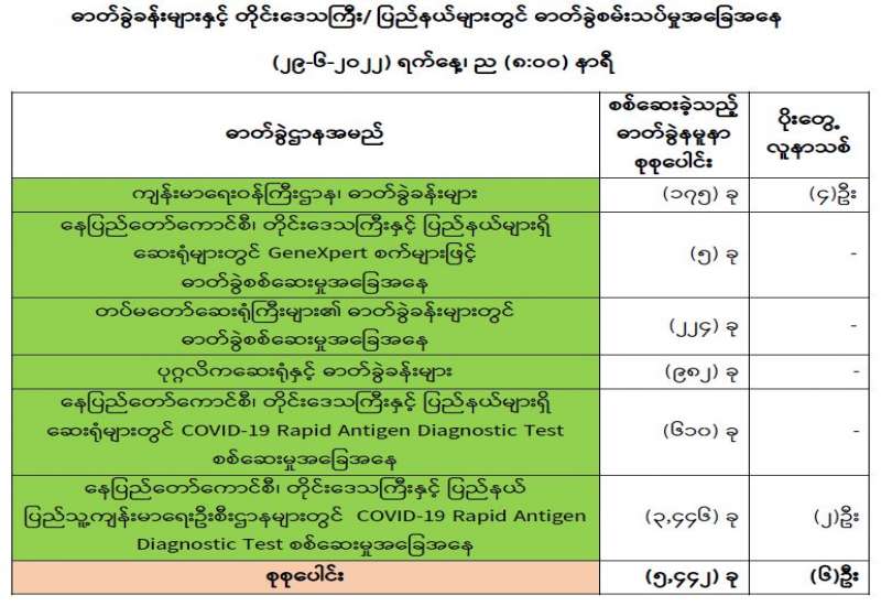 ကျန်းမာရေးဝန်ကြီးဌာနအနေဖြင့် နိုင်ငံအတွင်း ကူးစက်ဖြစ်ပွားနေသော COVID-19 ရောဂါ ကာကွယ်၊ ကုသ၊ ထိန်းချုပ်ရေးလုပ်ငန်းများကို အရှိန်အဟုန်မပြတ် ဆောင်ရွက်လျက်ရှိရာ ရောဂါထိန်းချုပ်ရေးလုပ်ငန်းများ အောင်မြင်နိုင်ရေးအတွက် ပြည်သူလူထုအနေဖြင့် ကျန်းမာရေးဝန်ကြီးဌာနမှ ထုတ်ပြန်ထားသော COVID-19 ရောဂါကာကွယ်ထိန်းချုပ်ရေးဆိုင်ရာ စည်းကမ်းများကို စနစ်တကျ လိုက်နာဆောင်ရွက်ရန်လိုအပ်ပြီး COVID-19 ကာကွယ်ဆေးထိုးနှံမှုခံယူခြင်းအား အထူးဂရုပြု ပူးပေါင်းဆောင်ရွက်ကြရန် လိုအပ်ပါသည်။