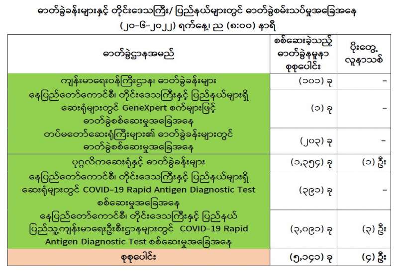 ကျန်းမာရေးဝန်ကြီးဌာနအနေဖြင့် နိုင်ငံအတွင်း ကူးစက်ဖြစ်ပွားနေသော COVID-19 ရောဂါ ကာကွယ်၊ ကုသ၊ ထိန်းချုပ်ရေးလုပ်ငန်းများကို အရှိန်အဟုန်မပြတ် ဆောင်ရွက်လျက်ရှိပါသည်။