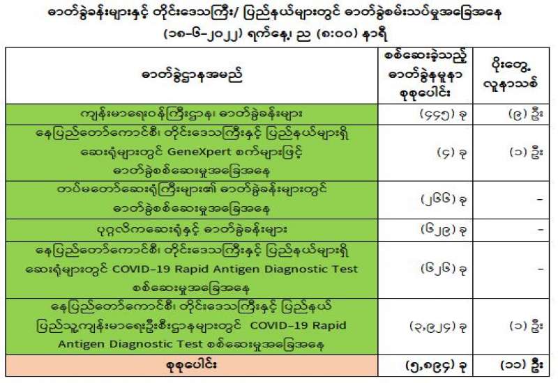 ကျန်းမာရေးဝန်ကြီးဌာနအနေဖြင့် နိုင်ငံအတွင်း ကူးစက်ဖြစ်ပွားနေသော COVID-19 ရောဂါ ကာကွယ်၊ ကုသ၊ ထိန်းချုပ်ရေးလုပ်ငန်းများကို အရှိန်အဟုန်မပြတ် ဆောင်ရွက်လျက်ရှိပါသည်။