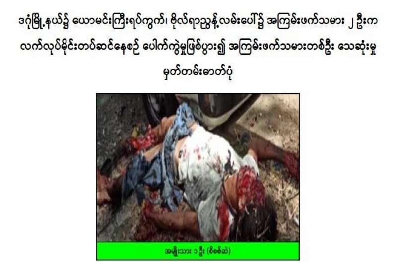 ရန်ကုန်တိုင်းဒေသကြီး၊ ဒဂုံမြို့နယ်နှင့် ကျောက်တန်းမြို့နယ်တို့၌ ဇွန်လ ၁၆ ရက်တွင် အကြမ်းဖက်သမားများက အကြမ်းဖက်မှုလုပ်ရပ်များလုပ်ဆောင်ရန် လက်လုပ်မိုင်းတပ်ဆင်နေစဉ် ပေါက်ကွဲမှုဖြစ်ပွား၍ အကြမ်းဖက်သူအမျိုးသား ၂ ဦးနှင့် အမျိုးသမီးတစ်ဦးတို့ သေဆုံးကာ ၉ လ အရွယ် အပြစ်မဲ့မိန်းကလေးငယ်တစ်ဦး စိုးရိမ်ရဒဏ်ရာရရှိခဲ့ကြောင်း သိရှိရသည်။