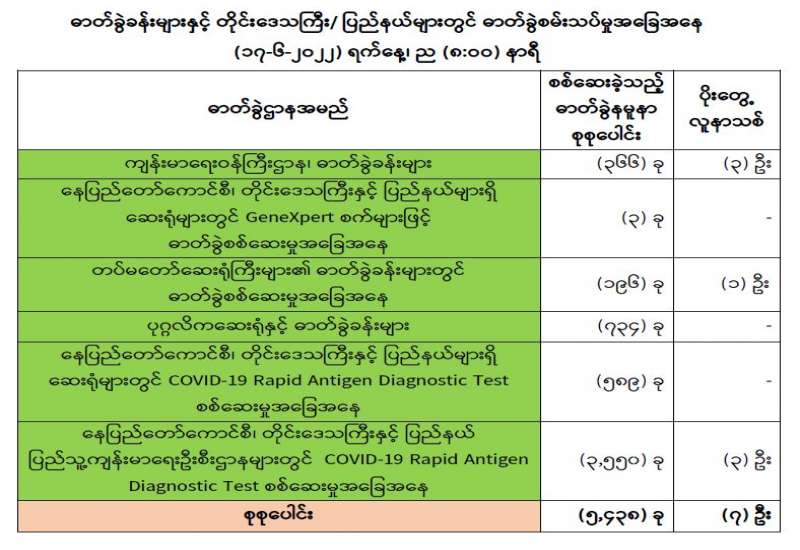 ကျန်းမာရေးဝန်ကြီးဌာနအနေဖြင့် နိုင်ငံအတွင်းကူးစက်ဖြစ်ပွားနေသော COVID-19 ရောဂါ ကာကွယ်၊ ကုသ၊ ထိန်းချုပ်ရေးလုပ်ငန်းများကို အရှိန်အဟုန်မပြတ် ဆောင်ရွက်လျက်ရှိပါသည်။