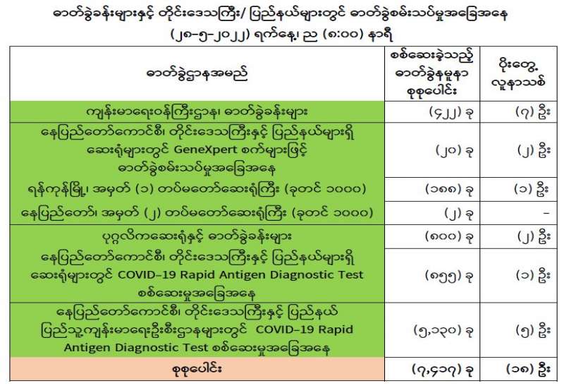 ကျန်းမာရေးဝန်ကြီးဌာနအနေဖြင့် နိုင်ငံအတွင်း ကူးစက်ဖြစ်ပွားနေသော COVID-19 ရောဂါ ကာကွယ်၊ ကုသ၊ ထိန်းချုပ်ရေးလုပ်ငန်းများကို အရှိန်အဟုန်မပြတ် ဆောင်ရွက်လျက်ရှိပါသည်။
