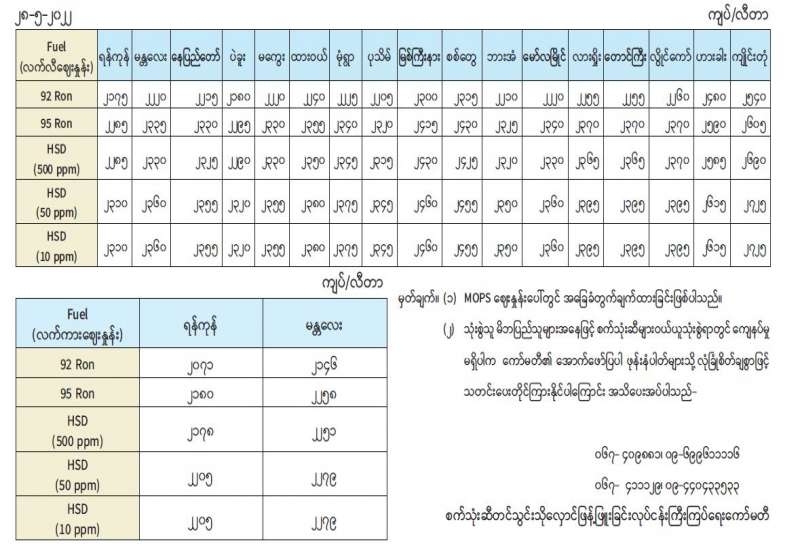 ရန်ကုန်မြို့နှင့် မန္တလေးမြို့အတွက် ရည်ညွှန်းလက်ကားဈေးနှုန်းများနှင့် ပြည်ထောင်စုနယ်မြေ နေပြည်တော်၊ တိုင်းဒေသကြီး/ပြည်နယ် မြို့တော်များအတွက် ရည်ညွှန်းလက်လီဈေးနှုန်းများ