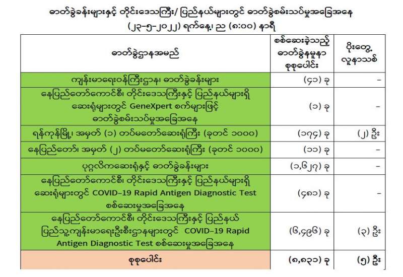 ကျန်းမာရေးဝန်ကြီးဌာနအနေဖြင့် နိုင်ငံအတွင်း ကူးစက်ဖြစ်ပွားနေသော COVID-19 ရောဂါ ကာကွယ်၊ ကုသ၊ ထိန်းချုပ်ရေးလုပ်ငန်းများကို အရှိန်အဟုန်မပြတ် ဆောင်ရွက်လျက်ရှိပါသည်။