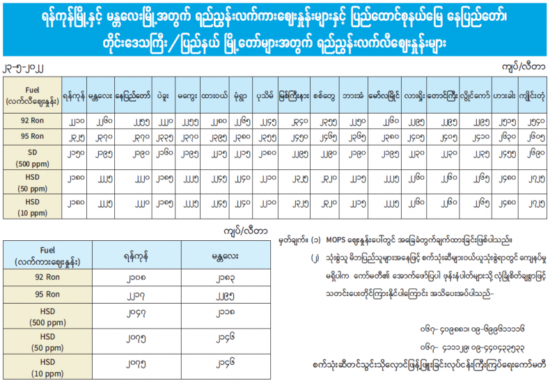 ရန်ကုန်မြို့နှင့် မန္တလေးမြို့တို့အတွက် ရည်ညွှန်းလက်ကားဈေးနှုန်းများနှင့် ပြည်ထောင်စုနယ်မြေ နေပြည်တော်၊ တိုင်းဒေသကြီး/ ပြည်နယ်မြို့တော်များအတွက် ရည်ညွှန်းလက်လီဈေးနှုန်းများ