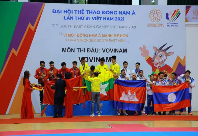 ဗီယက်နမ်နိုင်ငံ၌ အိမ်ရှင်အဖြစ် လက်ခံကျင်းပသည့် (၃၁)ကြိမ်မြောက် အရှေ့တောင်အာရှ အားကစားပြိုင်ပွဲကို မြို့အသီးသီးရှိ အားကစားကွင်း/ အားကစားရုံများ၌ ကျင်းပလျက်ရှိရာ ယနေ့ ညနေပိုင်းတွင် ဟနွိုင်းမြို့ရှိ Soc Son အားကစားရုံ၌ ဗိုဗီနမ်အားကစားနည်းမှ Male Leg Attack Technique 04 Males, Each Performs 2 Legs Attack Technique (လေးယောက်တွဲ)အပြပွဲစဉ်၌ မောင်အောင်ခိုင်လင်း၊ မောင်ရာဇာထွန်း၊ မောင်ဟိန်းထက်အောင်နှင့် မောင်ကျော်သူစိုးအောင်တို့က (၉)ခုမြောက် ရွှေတံဆိပ်ဆုကို ထိုက်ထိုက်တန်တန် ထပ်မံဆွတ်ခူးရယူပေးနိုင်ခဲ့ပြီး၊ (60)ကီလိုတန်း(အတိုက်)ပွဲစဉ်၌ မရွှေသက်ထားက ကြေးတံဆိပ်ဆုကို လည်းကောင်း၊ Bac Ninh Gymnasium အားကစားရုံ၌ လက်ဝှေ့အားကစားနည်းမှ (-57)ကီလိုတန်းပွဲစဉ်၌ မောင်နိုင်လတ်က ငွေတံဆိပ်ဆုကို လည်းကောင်း ထပ်မံဆွတ်ခူး ရရှိခဲ့ကြသည်။