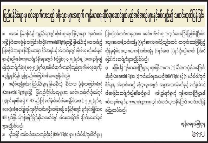 ပြည်ပနိုင်ငံများမှ ဝင်ရောက်လာသည့် ခရီးသွားများအတွက် ကျန်းမာရေးဆိုင်ရာ ဆောင်ရွက်မည့် အစီအစဉ်များနှင့်စပ်လျဉ်း၍ သတင်းထုတ်ပြန်ခြင်း