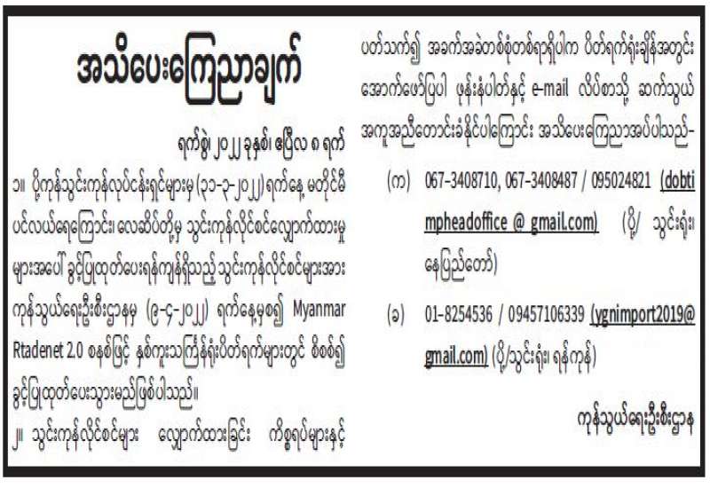 စီးပွားရေးနှင့်ကူးသန်းရောင်းဝယ်ရေး ဝန်ကြီးဌာနအနေဖြင့် ကိုဗစ်-၁၉ ရောဂါ ကာကွယ်၊ ထိန်းချုပ်၊ ကုသရေးဆိုင်ရာပစ္စည်းများကို လေကြောင်း၊ ရေကြောင်းနှင့် နယ်စပ်ကုန်သွယ်ရေး စခန်းများမှ နှောင့်နှေးကြန့်ကြာမှုမရှိ တင်သွင်းနိုင်ရေးအတွက် အချိန်နှင့်တစ်ပြေးညီ စီစဉ် ဆောင်ရွက်ပေးလျက်ရှိရာ ဧပြီ ၁ ရက်မှ ၉ ရက်အတွင်း ကုန်သွယ်ရေးစခန်းများမှ ကုမ္ပဏီသုံးခု၊ ယာဉ်စီးရေ လေးစီးဖြင့် နှာခေါင်းစည်း (Mask) ၂၆ တန် တင်သွင်းခဲ့သည်။