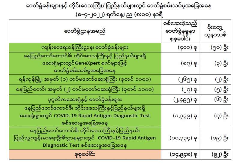 ကျန်းမာရေးဝန်ကြီးဌာနအနေဖြင့် နိုင်ငံအတွင်း ကူးစက်ဖြစ်ပွားနေသော COVID-19 ရောဂါ ကာကွယ်၊ ကုသ၊ ထိန်းချုပ်ရေးလုပ်ငန်းများကို အရှိန်အဟုန်မြှင့်ဆောင်ရွက်လျက်ရှိပါသည်။