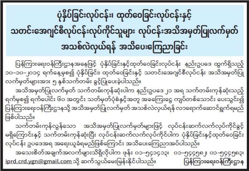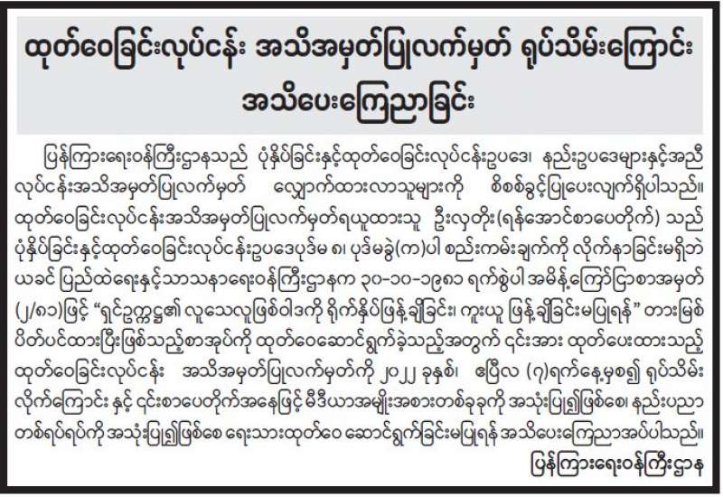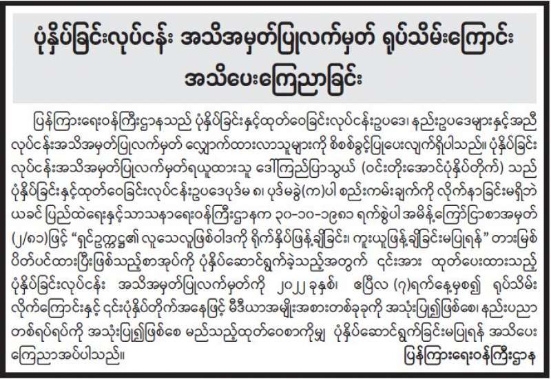 ပုံနှိပ်ခြင်းလုပ်ငန်း၊ ထုတ်ဝေခြင်းလုပ်ငန်းနှင့် သတင်းအေဂျင်စီလုပ်ငန်းလုပ်ကိုင်သူများ လုပ်ငန်းအသိ အမှတ်ပြုလက်မှတ် အသစ်လဲလှယ်ရန် အသိပေးကြေညာခြင်း