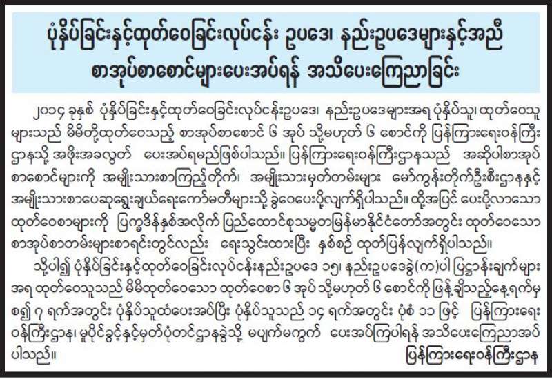 ပုံနှိပ်ခြင်းနှင့်ထုတ်ဝေခြင်းလုပ်ငန်း ဥပဒေ၊ နည်းဥပဒေများနှင့်အညီ စာအုပ်စာစောင်များပေးအပ်ရန် အသိပေးကြေညာခြင်း