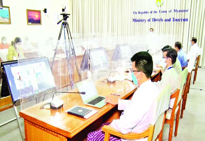 ဟိုတယ်နှင့် ခရီးသွားလာရေးဝန်ကြီးဌာန ပြည်ထောင်စုဝန်ကြီး ဒေါက်တာဌေးအောင်သည် ယနေ့နံနက်ပိုင်းတွင် ဝန်ကြီးဌာန နီလာအစည်း အဝေးခန်းမ၌ Video Conferencing စနစ်ဖြင့် ကျင်းပသည့် ဧည့်စာရင်းစီမံခန့်ခွဲမှုစနစ် လုံခြုံအဆင်ပြေလွယ်ကူစွာ အသုံးပြုနိုင်စေရန် အဆင့်မြှင့်တင် ထားရှိမှုအခြေအနေ ရှင်းလင်းတင်ပြသည့် အစည်းအဝေးသို့ တက်ရောက်သည်။