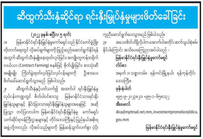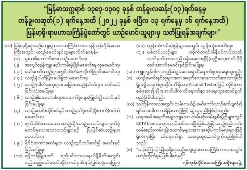ကျန်းမာရေးဝန်ကြီးဌာနအနေဖြင့် နိုင်ငံအတွင်း ကူးစက်ဖြစ်ပွားနေသော COVID-19 ရောဂါ ကာကွယ်၊ ကုသ၊ ထိန်းချုပ်ရေးလုပ်ငန်းများကို အရှိန်အဟုန်မြှင့်ဆောင်ရွက်လျက်ရှိရာ ရောဂါထိန်းချုပ်ရေးလုပ်ငန်းများ အောင်မြင်နိုင်ရေးအတွက် ပြည်သူလူထုအနေဖြင့် ကျန်းမာရေး ဝန်ကြီးဌာနမှ ထုတ်ပြန်ထားသော COVID-19 ရောဂါ ကာကွယ်ထိန်းချုပ်ရေးဆိုင်ရာစည်းကမ်းများကို စနစ်တကျ လိုက်နာဆောင်ရွက်ရန် လိုအပ်ပြီး COVID-19 ကာကွယ်ဆေးထိုးနှံမှုခံယူခြင်းအား အထူးဂရုပြု ပူးပေါင်းဆောင်ရွက်ကြရန် လိုအပ်ပါသည်။