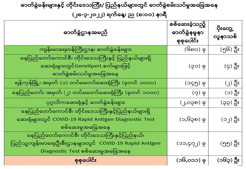 ကျန်းမာရေးဝန်ကြီးဌာနအနေဖြင့် နိုင်ငံအတွင်း ကူးစက်ဖြစ်ပွားနေသော COVID-19 ရောဂါ ကာကွယ်၊ ကုသ၊ ထိန်းချုပ်ရေးလုပ်ငန်းများကို အရှိန်အဟုန်မြှင့်ဆောင်ရွက်လျက်ရှိပါသည်။