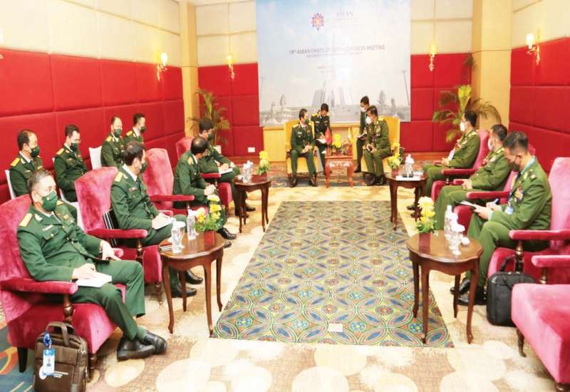 (၁၉)ကြိမ်မြောက် အာဆီယံ တပ်မတော်ကာကွယ်ရေးဦးစီးချုပ်များ အစည်းအဝေး 19 th ASEAN chiefs of Defence Forces Meeting (ACDFM-19) တက်ရောက်ရန် ကမ္ဘောဒီးယားနိုင်ငံသို့ ရောက်ရှိနေသည့် ညှိနှိုင်းကွပ်ကဲရေးမှူး (ကြည်း၊ ရေ၊ လေ) ဗိုလ်ချုပ်ကြီး မောင်မောင်အေးသည် ယနေ့တွင် အာဆီယံနိုင်ငံများမှ တပ်မတော်ကာကွယ်ရေးဦးစီးချုပ်များ၊ တာဝန်ရှိသူများနှင့် SOKHA Hotel ရှိ အစည်းအဝေးခန်းမ၌ သီးခြားစီတွေ့ဆုံသည်။