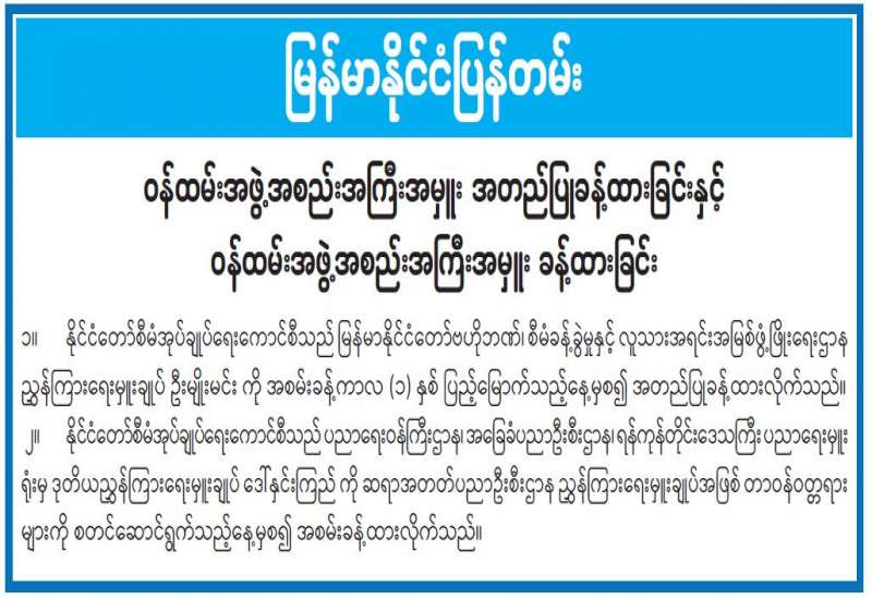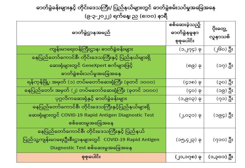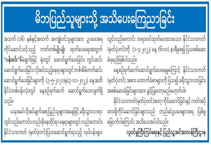 ကျန်းမာရေးဝန်ကြီးဌာနအနေဖြင့် နိုင်ငံအတွင်း ကူးစက်ဖြစ်ပွားနေသော COVID-19 ရောဂါ ကာကွယ်၊ ကုသ၊ ထိန်းချုပ်ရေးလုပ်ငန်းများကို အရှိန်အဟုန်မြှင့် ဆောင်ရွက်လျက်ရှိရာ ရောဂါထိန်းချုပ်ရေးလုပ်ငန်းများ အောင်မြင်နိုင်ရေးအတွက် ပြည်သူလူထုအနေဖြင့် ကျန်းမာရေးဝန်ကြီးဌာနမှ ထုတ်ပြန်ထားသော COVID-19 ရောဂါကာကွယ် ထိန်းချုပ်ရေးဆိုင်ရာ စည်းကမ်းများကို စနစ်တကျလိုက်နာ ဆောင်ရွက်ရန်လိုအပ်ပြီး COVID-19 ကာကွယ်ဆေး ထိုးနှံမှုခံယူခြင်းအား အထူးဂရုပြု ပူးပေါင်းဆောင်ရွက်ကြရန် လိုအပ်ပါသည်။