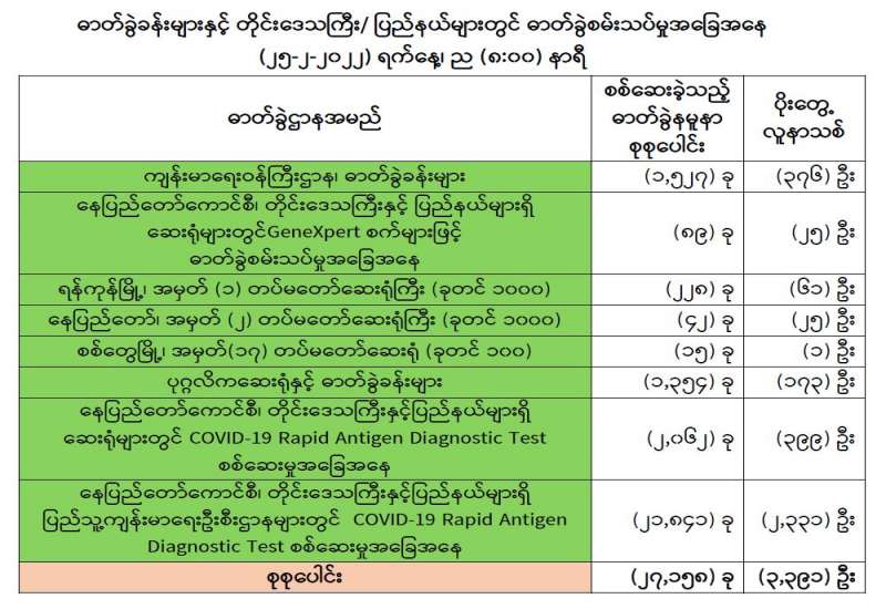 ကျန်းမာရေးဝန်ကြီးဌာနအနေဖြင့် နိုင်ငံအတွင်း ကူးစက်ဖြစ်ပွားနေသော COVID-19 ရောဂါ ကာကွယ်၊ ကုသ၊ ထိန်းချုပ်ရေးလုပ်ငန်းများကို အရှိန်အဟုန်မြှင့် ဆောင်ရွက်လျက်ရှိပါသည်။