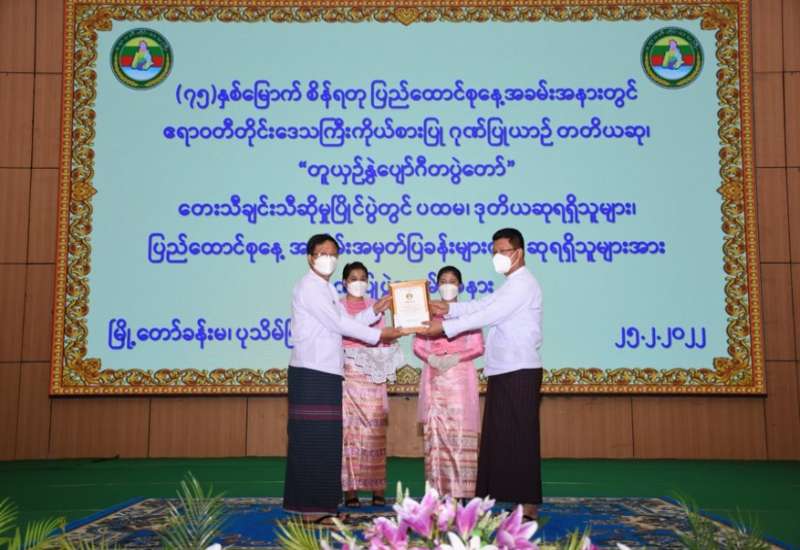 (၇၅)နှစ်မြောက်စိန်ရတုပြည်ထောင်စုနေ့အခမ်းအနားတွင် တိုင်းဒေသကြီးကိုယ်စား ပြုယာဉ် တတိယဆု၊ “တူယှဉ်နွှဲပျော်ဂီတပွဲတော်” တေးသီချင်းသီဆိုမှုပြိုင်ပွဲတွင် ပထမ၊ ဒုတိယဆုရရှိသူများ၊ ပြည်ထောင်စုနေ့အထိမ်းအမှတ်ပြခန်းများတွင် ဆုရရှိသူများအား ဂုဏ်ပြုပွဲကို ယနေ့နေ့လယ်ပိုင်းတွင် ဧရာဝတီတိုင်းဒေသကြီး၊ ပုသိမ်မြို့ မြို့တော်ခန်းမ၌ ကိုဗစ်-၁၉ စည်းမျဉ်းစည်းကမ်းများနှင့်အညီ ပြုလုပ်ရာ တိုင်းဒေသကြီးဝန်ကြီးချုပ် ဦးတင်မောင်ဝင်း၊ အနောက်တောင်တိုင်းစစ်ဌာနချုပ် ဒုတိယတိုင်းမှူး ဗိုလ်မှူးချုပ် အောင်ခင်ဇော်နှင့် ဌာနဆိုင်ရာတာဝန်ရှိသူများ၊ စိန်ရတုပြည်ထောင်စုနေ့ အခမ်းအနားတွင် တိုင်းဒေသကြီးကိုယ်စားပြု ဆုရရှိကြသူများနှင့် ဖိတ်ကြားထားသူများ တက်ရောက်ကြသည်။