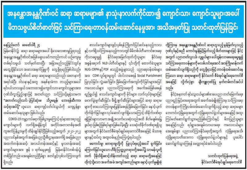 အကြမ်းဖက်အုပ်စုအဖြစ်ကြေငြာထားသော CRPH၊ NUG နှင့် ယင်းတို့၏ လက်အောက်ခံ အဖွဲ့ အစည်းများ၊ ယင်းတို့နှင့်ဆက်နွယ်နေသော အဖွဲ့အစည်းများ၊ လူပုဂ္ဂိုလ်များသည် နိုင်ငံတော် တည်ငြိမ် အေးချမ်းရေးကို ပျက်ပြားစေရန်နှင့် ပြည်သူလူထုကို အကြောက်တရားများ ဖြစ်ပေါ်စေပြီး အစိုးရ ယန္တရားများ ပျက်ပြားစေရန် ရည်ရွယ်လျက် လှုံ့ဆော်ခြင်း၊ ဝါဒဖြန့်ခြင်း၊ ခြိမ်းခြောက်ခြင်းများကို လူမှုကွန်ယက်များမှတစ်ဆင့် နည်းမျိုးစုံဖြင့် ပြုလုပ်လျက်ရှိပါသည်။