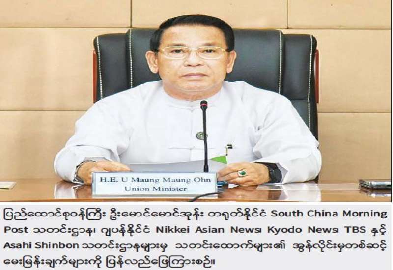 ပြည်ထောင်စုဝန်ကြီး ဦးမောင်မောင်အုန်းသည် တရုတ်နိုင်ငံ South China Morning Post သတင်းဌာန၊ ဂျပန်နိုင်ငံ Nikkei Asian News၊ Kyodo News၊ TBS နှင့် Asahi Shinbon သတင်းဌာနများမှ သတင်းထောက်များအား ယနေ့ မွန်းလွဲပိုင်းတွင် ဗီဒီယိုကွန်ဖရင့်ဖြင့် တွေ့ဆုံပြီး မေးမြန်းချက်များကို ပြန်လည်ဖြေကြားခဲ့သည်။