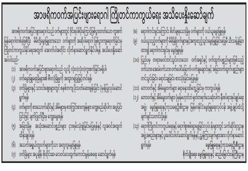 တိုင်းဒေသကြီးနှင့် ပြည်နယ်အသီးသီးတို့၌ သံဃာတော်များ၊ သာသနာနွယ်ဝင်သီလရှင်များ၊ ဘာသာရေးခေါင်းဆောင်များ အပါအဝင် လူမျိုးမရွေး ဘာသာမရွေး အသက် ၄၀ နှစ်အထက် ဒေသခံပြည်သူများ၊ အကျဉ်းသား၊ အကျဉ်းသူများ၊ မသန်စွမ်းသူများ၊ တိုင်းရင်းသား လက်နက်ကိုင်အဖွဲ့များ၊ နာတာရှည်ရောဂါအခံရှိသူများ၊ ကယ်ဆယ်ရေးစခန်းများ၊ ယာယီတိုက်ပွဲရှောင် စခန်းများအတွင်းရှိ ပြည်သူများ၊ အသက် (၁၂)နှစ်အထက် အခြေခံပညာအလယ်တန်းနှင့် အထက်တန်းအဆင့် ကျောင်းသား၊ ကျောင်းသူများ စသည့် ဦးတည်အုပ်စု များသတ်မှတ်၍ တပ်မတော်မှ ဆေးအဖွဲ့များ၊ ပြည်သူ့ဆေးရုံများမှ ဆရာဝန်များ၊ သူနာပြုများ၊ ကျန်းမာရေးဝန်ထမ်းများနှင့် စေတနာ့ဝန်ထမ်းများက ကာကွယ်ဆေးထိုးခြင်းလုပ်ငန်းများကို အင်တိုက်အားတိုက် ဆောင်ရွက်ပေးလျက်ရှိသည်။