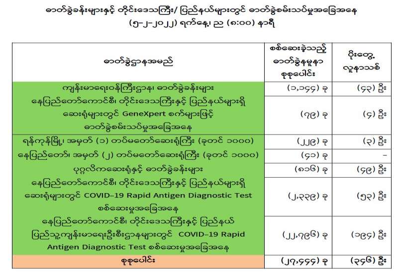 ကျန်းမာရေးဝန်ကြီးဌာနအနေဖြင့် နိုင်ငံအတွင်း ကူးစက်ဖြစ်ပွားနေသော COVID-19 ရောဂါ ကာကွယ်၊ ကုသ၊ ထိန်းချုပ်ရေးလုပ်ငန်းများကို အရှိန်အဟုန်မြှင့် ဆောင်ရွက်လျက်ရှိပါသည်။