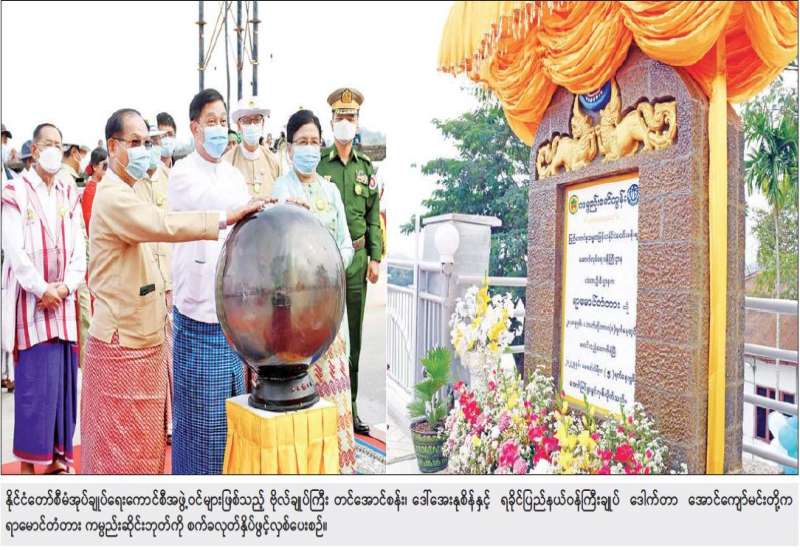 (၇၅)နှစ်မြောက်စိန်ရတုပြည်ထောင်စုနေ့ အထိမ်းအမှတ် ရခိုင်ပြည်နယ် မင်းပြားမြို့ နယ်အတွင်း ရန်ကုန်-စစ်တွေသွားကားလမ်းပေါ်တွင် အသစ်တည်ဆောက်ပြီးသည့် ရာမောင်တံတား ဖွင့်ပွဲကို ယနေ့နံနက်ပိုင်းတွင် ကျင်းပပြုလုပ်ရာ အခမ်းအနားသို့ နိုင်ငံတော်စီမံအုပ်ချုပ် ရေးကောင်စီဝင်များဖြစ်ကြသည့် ဗိုလ်ချုပ်ကြီး တင်အောင်စန်း၊ မန်းငြိမ်းမောင်၊ ဒေါ်အေးနုစိန်၊ ဦးမောင်းဟာ၊ ဆောက်လုပ်ရေးဝန်ကြီးဌာန ပြည်ထောင်စုဝန်ကြီး ဦးရွှေလေး၊ ရခိုင်ပြည်နယ်ဝန်ကြီးချုပ် ဒေါက်တာ အောင်ကျော်မင်း၊ အနောက်ပိုင်းတိုင်း စစ်ဌာနချုပ် တိုင်းမှူး ဗိုလ်ချုပ် ထင်လတ်ဦး၊ ပြည်နယ်ဝန်ကြီးများ၊ ဌာနဆိုင်ရာ တာဝန်ရှိသူများနှင့် ဒေသခံပြည်သူများ တက်ရောက်ကြသည်။