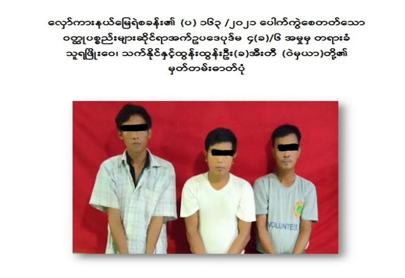 မန္တလေးတိုင်းဒေသကြီး၊ ပြည်ကြီးတံခွန်မြို့နယ်ရှိ “မောသစ်”ရွှေဆိုင်နှင့် ချမ်းအေးသာစံမြို့နယ်ရှိ “ဝိန့်လီ” ရွှေဆိုင်တို့ကို သေနတ်များ ပစ်ခတ်ခြိမ်းခြောက်ကာ ရွှေထည်ပစ္စည်းများနှင့်ငွေများ ဓားပြတိုက်၊ လုယက်ယူဆောင်သွားသူများကို ဒုစရိုက်မှုမလို လားသည့် ပြည်သူများ၏ ပူးပေါင်း ကူညီမှုဖြင့် ဖမ်းဆီးရမိခဲ့ကြောင်း သိရသည်။