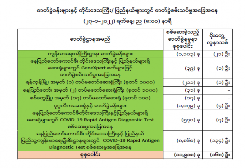 ကျန်းမာရေးဝန်ကြီးဌာနအနေဖြင့် နိုင်ငံအတွင်း ကူးစက်ဖြစ်ပွားနေသော COVID-19 ရောဂါ ကာကွယ်၊ ကုသ၊ ထိန်းချုပ်ရေး လုပ်ငန်းများကို အရှိန်အဟုန်မြှင့်ဆောင်ရွက်လျက်ရှိပါသည်။