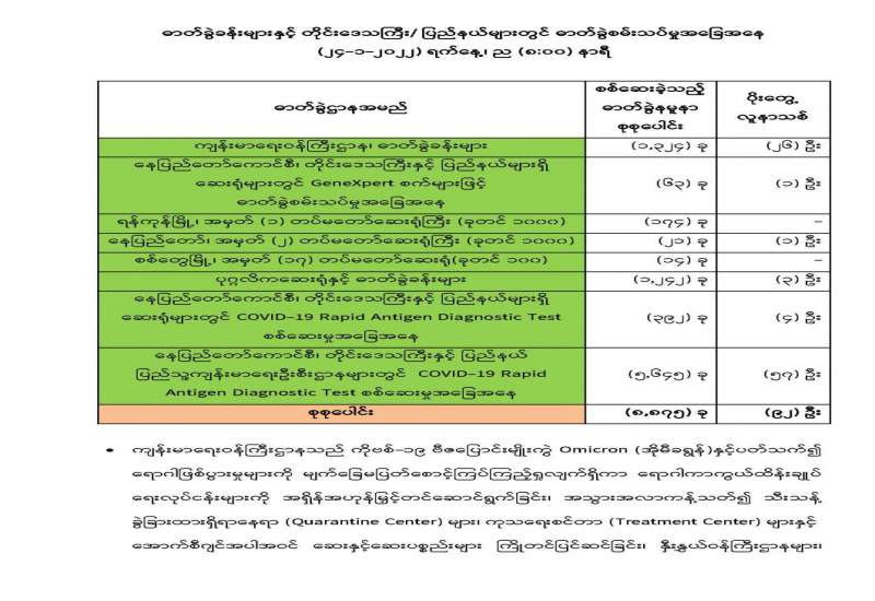 ၁။ ကျန်းမာရေးဝန်ကြီးဌာနသည် “ကိုဗစ်-၁၉ ရောဂါ မျိုးရိုးဗီဇပြောင်း ရောဂါပိုး စောင့်ကြပ်ကြည့်ရှုခြင်း လုပ်ငန်း” များကို စဉ်ဆက်မပြတ် ဆောင်ရွက်လျက်ရှိရာ မြန်မာနိုင်ငံသို့ ပြည်ပနိုင်ငံများမှ ကယ်ဆယ်ရေး လေယာဉ် (Relief Flight) များဖြင့် ပြန်လည်ဝင်ရောက်လာသူများတွင် SARS-CoV-2 Variant Omicron (အိုမီခရွန်) ရောဂါပိုးတွေ့ရှိမှုများနှင့်ပတ်သက်၍ ကျန်းမာရေးဝန်ကြီးဌာနမှ အချိန်နှင့်တပြေးညီ သတင်းထုတ်ပြန်ပေးလျက်ရှိပါသည်။