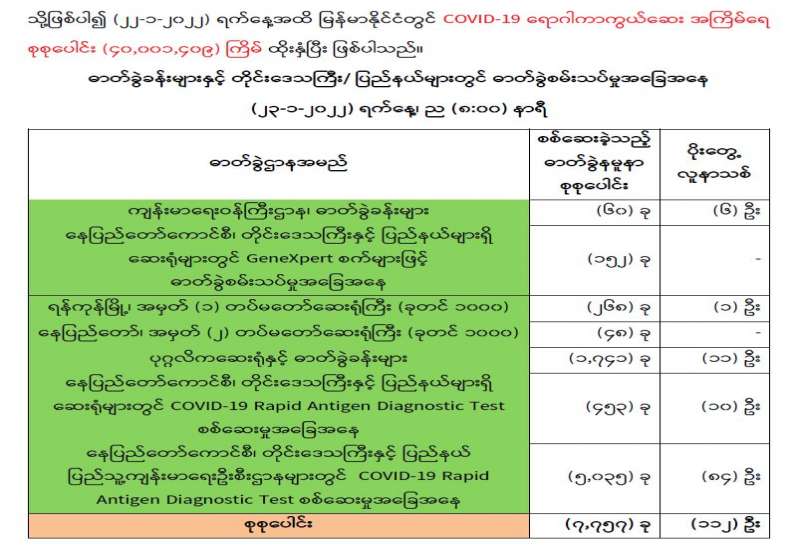ကျန်းမာရေးဝန်ကြီးဌာနအနေဖြင့် နိုင်ငံအတွင်း ကူးစက်ဖြစ်ပွားနေသော COVID-19 ရောဂါ ကာကွယ်၊ ကုသ၊ ထိန်းချုပ်ရေးလုပ်ငန်းများကို အရှိန်အဟုန်မြှင့် ဆောင်ရွက်လျက်ရှိပါသည်။