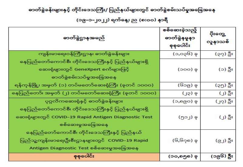 ကျန်းမာရေးဝန်ကြီးဌာနအနေဖြင့် နိုင်ငံအတွင်း ကူးစက်ဖြစ်ပွားနေသော COVID-19 ရောဂါ ကာကွယ်၊ ကုသ၊ ထိန်းချုပ်ရေးလုပ်ငန်းများကို အရှိန်အဟုန်မြှင့် ဆောင်ရွက်လျက်ရှိရာ ရောဂါ ထိန်းချုပ်ရေးလုပ်ငန်းများ အောင်မြင်နိုင်ရေးအတွက် ပြည်သူလူထုအနေဖြင့် ကျန်းမာရေး ဝန်ကြီး ဌာနမှထုတ်ပြန်ထားသော COVID-19 ရောဂါ ကာကွယ် ထိန်းချုပ်ရေးဆိုင်ရာ စည်းကမ်း များကို စနစ်တကျ လိုက်နာဆောင်ရွက်ရန်လိုအပ်ပြီး COVID-19 ကာကွယ်ဆေး ထိုးနှံမှု ခံယူခြင်းအား အထူးဂရုပြု ပူးပေါင်းဆောင်ရွက်ကြရန် လိုအပ်ပါသည်။
