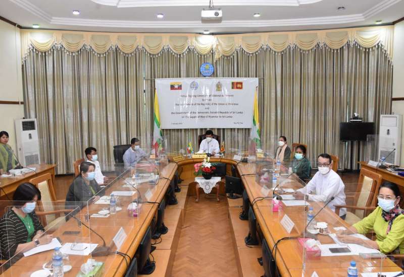 မြန်မာနိုင်ငံမှ သီရိလင်္ကာနိုင်ငံသို့ G to G အစီအစဉ်ဖြင့် ဆန်တင်ပို့ ရောင်းချနိုင်ရေးအတွက် မြန်မာနိုင်ငံ၊ စီးပွားရေးနှင့် ကူးသန်းရောင်းဝယ်ရေးဝန်ကြီးဌာနနှင့် သီရိလင်္ကာနိုင်ငံ၊ ကုန်သွယ်ရေးဝန်ကြီး ဌာနတို့အကြား နှစ်နိုင်ငံသဘောတူစာချုပ် (Bilateral Agreement) လက်မှတ်ရေးထိုးခြင်း အခမ်းအနားကို ယနေ့မွန်းလွဲ ၂ နာရီခွဲတွင်တွင် စီးပွားရေးနှင့် ကူးသန်း ရောင်းဝယ်ရေးဝန်ကြီးဌာန၊ အစည်းအဝေးခန်းမ၌ Virtual စနစ်ဖြင့် ကျင်းပရာ သီရိလင်္ကာနိုင်ငံ၊ ကုန်သွယ်ရေးဝန်ကြီး Dr. Bandula Gunawardhana နှင့် စီးပွားရေးနှင့် ကူးသန်းရောင်းဝယ်ရေး ဝန်ကြီးဌာန၊ ပြည်ထောင်စုဝန်ကြီး ဒေါက်တာပွင့်ဆန်းတို့ တက်ရောက်ပြီး အမှာစကားများ ပြောကြားသည်။