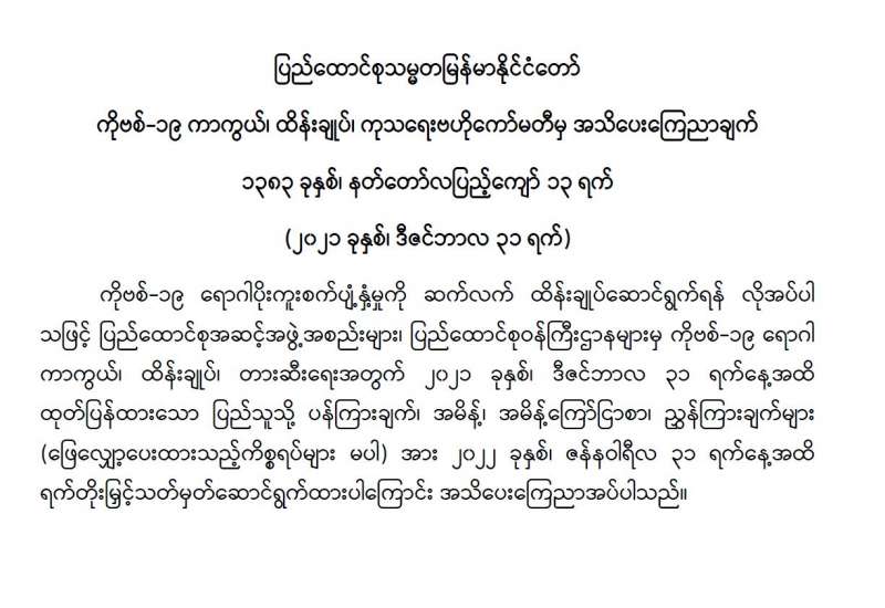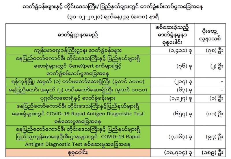 ကျန်းမာရေးဝန်ကြီးဌာနအနေဖြင့် နိုင်ငံအတွင်း ကူးစက်ဖြစ်ပွားနေသော COVID-19 ရောဂါ ကာကွယ်၊ ကုသ၊ ထိန်းချုပ်ရေးလုပ်ငန်းများကို အရှိန်အဟုန်မြှင့်ဆောင်ရွက်လျက်ရှိပါသည်။