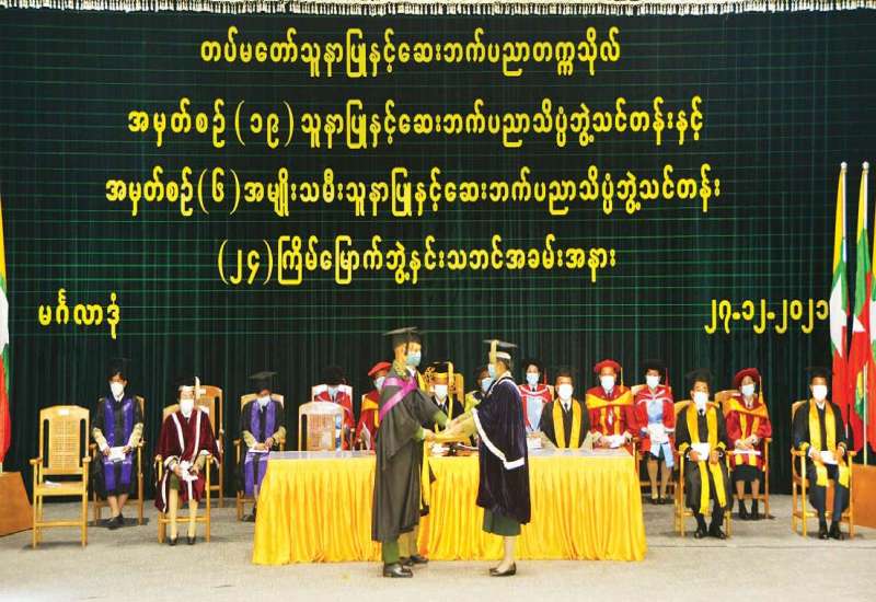 တပ်မတော်သူနာပြုနှင့် ဆေးဘက်ပညာတက္ကသိုလ်၏ (၂၄) ကြိမ်မြောက် ဘွဲ့နှင်းသဘင် အခမ်းအနားကို ယနေ့မွန်းလွဲပိုင်းတွင် ရန်ကုန်တိုင်းဒေသကြီး၊ မင်္ဂလာဒုံမြို့နယ်ရှိ တပ်မတော် သူနာပြုနှင့် ဆေးဘက်ပညာတက္ကသိုလ် ဘွဲ့နှင်းသဘင်ခန်းမ၌ ကျင်းပရာ တပ်မတော် သူနာပြုနှင့် ဆေးဘက်ပညာတက္ကသိုလ် ကျောင်းအုပ်ကြီး ဗိုလ်မှူးချုပ်ဝင်းဗိုလ်နှင့် ပညာရေး အဖွဲ့ဝင်များ တက်ရောက်ကြသည်။