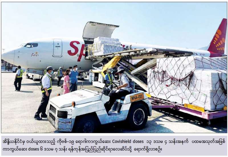 အိန္ဒိယနိုင်ငံမှ ဝယ်ယူထားသည့် ကိုဗစ်-၁၉ ရောဂါကာကွယ်ဆေး Covishield အမှတ်တံဆိပ် ကာကွယ်ဆေး doses ၁၃ ဒသမ ၄ သန်းအနက် ပထမ အသုတ်အဖြစ် ကာကွယ်ဆေး doses ၆ ဒသမ ၇ သန်း ရန်ကုန်အပြည်ပြည်ဆိုင်ရာလေဆိပ်သို့ ဒီဇင်ဘာ ၂၇ ရက် နံနက် ၁၁ နာရီ ၂၅ မိနစ်ကရောက်ရှိလာခဲ့ရာ ရန်ကုန်တိုင်းဒေသကြီး ကုသရေးနှင့်ပြည်သူ့ကျန်းမာရေး ဦးစီးဌာနမှူး ဦးဆောင်သည့်အဖွဲ့က လက်ခံရယူသည်။