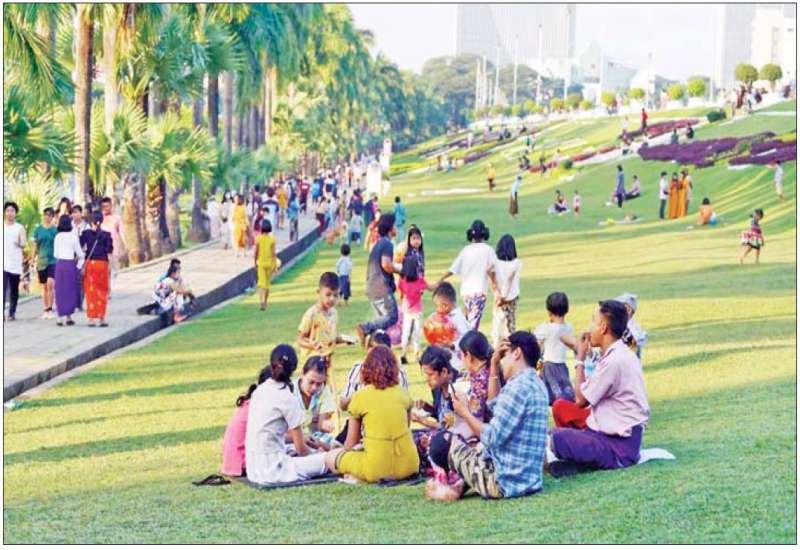 ရန်ကုန်မြို့ ပြည်လမ်း အင်းလျား ကန်ပေါင် ပန်းခြံမြက်ခင်းပြင်တွင် အများပြည်သူရုံးပိတ်ရက်ကာလ မိသားစုများ အနားယူအပန်းဖြေသူများ စည်ကားနေသည်ကို ခရစ္စမတ်ရုံးပိတ်ရက် ဒီဇင်ဘာ ၂၅ ရက် ညနေခင်း၌ မြင်တွေ့ရသည်။