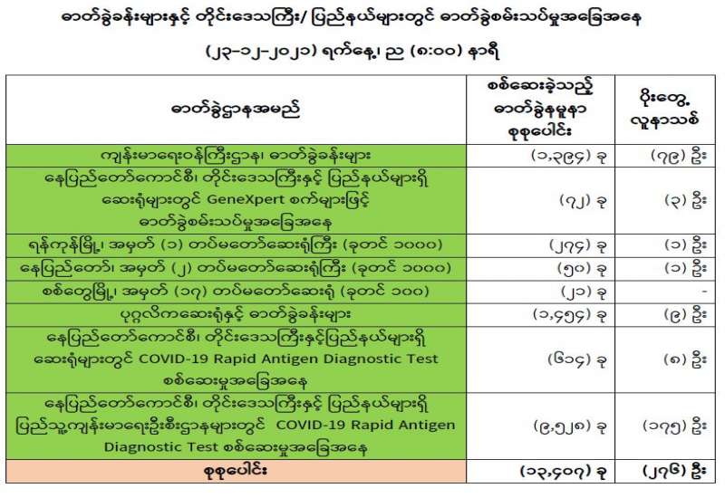 ကျန်းမာရေးဝန်ကြီးဌာနအနေဖြင့် နိုင်ငံအတွင်း ကူးစက်ဖြစ်ပွားနေသော COVID-19 ရောဂါ ကာကွယ်၊ ကုသ၊ ထိန်းချုပ်ရေးလုပ်ငန်းများကို အရှိန်အဟုန်မြှင့်ဆောင်ရွက်လျက်ရှိရာ ရောဂါထိန်း ချုပ်ရေးလုပ်ငန်းများ အောင်မြင်နိုင်ရေးအတွက် ပြည်သူလူထုအနေဖြင့် ကျန်းမာရေးဝန်ကြီးဌာနမှ ထုတ်ပြန်ထားသော COVID-19 ရောဂါကာကွယ် ထိန်းချုပ်ရေးဆိုင်ရာစည်း ကမ်းများကို စနစ်တကျ လိုက်နာဆောင်ရွက်ရန်လိုအပ်ပြီး COVID-19 ကာကွယ်ဆေးထိုးနှံမှုခံယူခြင်းအား အထူးဂရုပြု ပူးပေါင်းဆောင်ရွက်ကြရန် လိုအပ်ပါသည်။