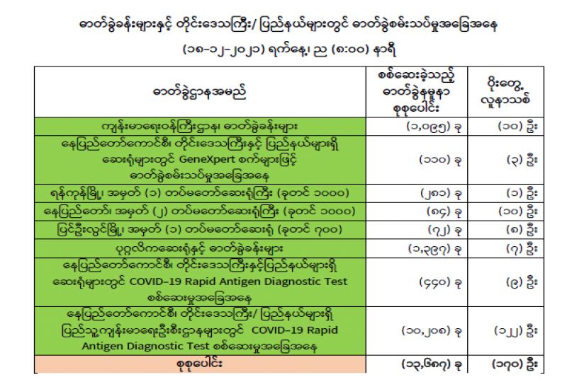 (၁၈-၁၂-၂၀၂၁) ရက်နေ့၊ ည (၈:၀၀) နာရီ ကျန်းမာရေးဝန်ကြီးဌာနအနေဖြင့် နိုင်ငံအတွင်း ကူးစက်ဖြစ်ပွားနေသော COVID-19 ရောဂါ ကာကွယ်၊ ကုသ၊ ထိန်းချုပ်ရေးလုပ်ငန်းများကို အရှိန်အဟုန်မြှင့်ဆောင်ရွက်လျက်ရှိပါသည်။