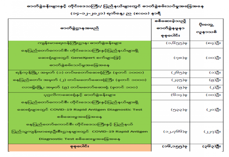 (၁၄-၁၂-၂၀၂၁) ရက်နေ့၊ ည (၈:၀၀) နာရီ ကျန်းမာရေးဝန်ကြီးဌာနအနေဖြင့် နိုင်ငံအတွင်း ကူးစက်ဖြစ်ပွားနေသော COVID-19 ရောဂါ ကာကွယ်၊ ကုသ၊ ထိန်းချုပ်ရေးလုပ်ငန်းများကို အရှိန်အဟုန်မြှင့်ဆောင်ရွက်လျက်ရှိပါသည်။