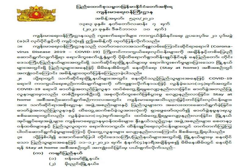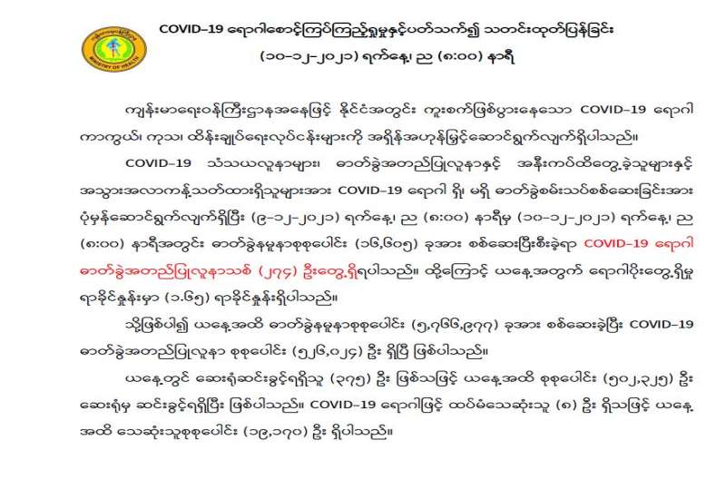 စီးပွားရေးနှင့် ကူးသန်းရောင်းဝယ်ရေးဝန်ကြီးဌာနအနေဖြင့် ကိုဗစ်-၁၉ ရောဂါ ကာကွယ်၊ ထိန်းချုပ်၊ ကုသရေးဆိုင်ရာပစ္စည်းများကိုလေကြောင်း၊ ရေကြောင်းနှင့်နယ်စပ်ကုန်သွယ်ရေး စခန်းများမှနှောင့်နှေးကြန့်ကြာမှုမရှိ တင်သွင်းနိုင်ရေးအတွက် အချိန်နှင့်တစ်ပြေးညီ စီစဉ် ဆောင်ရွက်ပေးလျက်ရှိရာ ယနေ့တွင် အပြည်ပြည်ဆိုင်ရာ ဆိပ်ကမ်းများနှင့် ချင်းရွှေဟော် ကုန်သွယ်ရေးစခန်း၊ မြဝတီကုန်သွယ်ရေးဇုန်နှင့် ကျိုင်းတုံပို့ကုန်သွင်းကုန်ရုံးတို့မှ ကုမ္ပဏီ (၃)ခု၊ ယာဉ်စီးရေ (၇)စီးဖြင့် အောက်ဆီဂျင် (အရည်) Bowser ယာဉ် (၁)စီးဖြင့် တန် (၂၀) နှင့် နှာခေါင်းစည်း (Mask) (၂၉) တန်တို့ကို တင်သွင်းခဲ့သည်။ အောက်ဆီဂျင်အရည် (Bowser) ယာဉ်(၁)စီးမှာ မြဝတီကုန်သွယ်ရေးဇုန်မှ ရန်ကုန်မြို့သို့ ဖြစ်ကြောင်း သိရသည်။