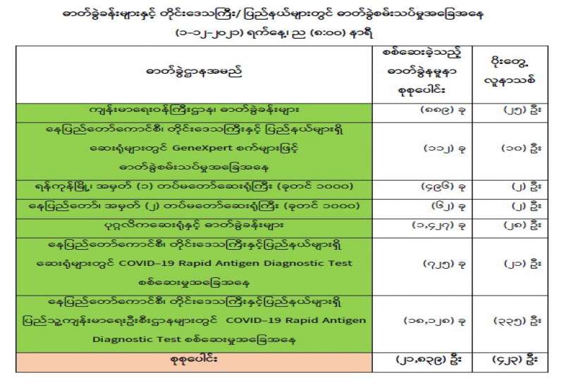 ကျန်းမာရေးဝန်ကြီးဌာနအနေဖြင့် နိုင်ငံအတွင်း ကူးစက်ဖြစ်ပွားနေသော COVID-19 ရောဂါ ကာကွယ်၊ ကုသ၊ ထိန်းချုပ်ရေးလုပ်ငန်းများကို အရှိန်အဟုန်မြှင့်ဆောင်ရွက်လျက်ရှိပါသည်။