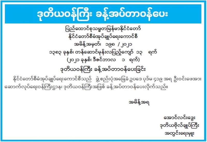မြန်မာနိုင်ငံ စာကြည့်တိုက်များ ဖောင်ဒေး ရှင်း ဗဟိုအလုပ်အမှုဆောင်အဖွဲ့ အစည်း အဝေးကို ယနေ့ နံနက် ၁၀ နာရီတွင် ရန်ကုန်မြို့ သိမ်ဖြူလမ်း အမှတ်(၂၂၈)ရှိ မြန်မာနိုင်ငံ စာကြည့်တိုက်များ ဖောင်ဒေးရှင်း အစည်းအဝေးခန်းမ၌ ကျင်းပရာ ဥက္ကဋ္ဌနှင့် အဖွဲ့ဝင်များ တက်ရောက်ကြသည်။
