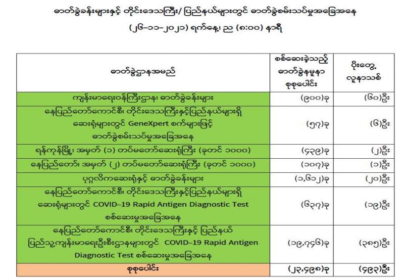 ကျန်းမာရေးဝန်ကြီးဌာနအနေဖြင့် နိုင်ငံအတွင်း ကူးစက်ဖြစ်ပွားနေသော COVID-19 ရောဂါ ကာကွယ်၊ ကုသ၊ ထိန်းချုပ်ရေးလုပ်ငန်းများကို အရှိန်အဟုန်မြှင့်ဆောင်ရွက်လျက်ရှိပါသည်။