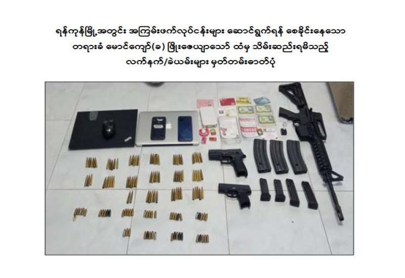 အကြမ်းဖက်အဖွဲ့အစည်းဖြစ်သော CRPH၊ NUG နှင့် PDF အဖွဲ့များ၏ အကြမ်းဖက် လုပ်ရပ်များအား ဖော်ထုတ်ဖမ်းဆီးနိုင်ရေးဆောင်ရွက်လျက်ရှိရာ အကြမ်းဖက် အဖွဲ့အစည်း ဖြစ်သည့် NUG နှင့် NLD ပါတီဝင် ဖြိုးဇေယျာသော်တို့၏ စေခိုင်းချက်အရ သန်လျင်တံတား၊ မြောက်ဉက္ကလာပတံတား၊ ထန်းတပင်မြို့နယ်နှင့် ကြည့်မြင်တိုင် မြို့နယ်၊ ဗားကရာမီးပွိုင့်ရှိ လုံခြုံရေးအဖွဲ့ဝင်များအား ပစ်ခတ်ခဲ့သူများနှင့် ရန်ကုန်မြို့ အတွင်း အကြမ်းဖက်လုပ်ငန်းများ ဆောင်ရွက်ခဲ့သည့် ဖြစ်စဉ်တွင် ပါဝင်ကျူးလွန် ခဲ့သော တရားခံ ကျား ၄၀ ဦး၊ မ ၇ ဦး၊ ပေါင်း ၄၇ ဦးအား လက်နက်ငယ် မျိုးစုံ ၃၄ လက်၊ ကျည်အိမ်မျိုးစုံ ၇၀ ခု၊ ကျည်မျိုးစုံ ၂၁၀၅ တောင့်၊ ၄၀ မမဗုံးသီး ၁၇ လုံး၊ လက်လုပ်ဗုံး ၁၀ လုံး၊ ရီမုမိုင်း ၄ လုံး၊ ရှေ့ထွက်မိုင်း ၄ ခု၊ မီးခိုးဗုံး ၅ လုံး၊ ရှို့ပစ် ၂ လုံး၊ ယမ်းမှုန့် (မီးခိုရောင်) ၇ ထုပ်၊ မှန်ပြောင်း ၁ ခုနှင့် စိတ်ကြွရူးသွပ်ဆေးပြားများအား ဖမ်းဆီးရမိခဲ့သည့် ဖြစ်စဉ်အား နိုဝင်ဘာလ ၁၇ ရက်တွင် သတင်းထုတ်ပြန်ခဲ့ပြီး ဖြစ်သည်။