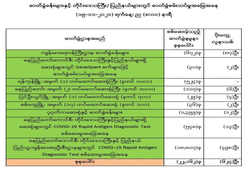ကျန်းမာရေးဝန်ကြီးဌာနအနေဖြင့် နိုင်ငံအတွင်း ကူးစက်ဖြစ်ပွားနေသော COVID-19 ရောဂါ ကာကွယ်၊ ကုသ၊ ထိန်းချုပ်ရေးလုပ်ငန်းများကို အရှိန်အဟုန်မြှင့်ဆောင်ရွက်လျက်ရှိပါသည်။