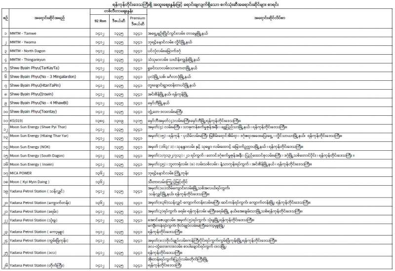 စီးပွားရေးနှင့် ကူးသန်းရောင်းဝယ်ရေးဝန်ကြီးဌာနနှင့် မြန်မာနိုင်ငံစက်သုံးဆီတင်သွင်း ဖြန့်ဖြူးရောင်းချရေးအသင်းတို့ ပူးပေါင်းစီစဉ်မှုဖြင့်ပြည်သူများ သက်သာသောဈေးနှုန်းဖြင့် ဝယ်ယူရရှိနိုင်ရန်ရည်ရွယ်၍ ဗဟိုဘဏ်မှ ရည်ညွှန်းငွေလဲနှုန်းဖြင့် တိုက်ရိုက်ရောင်းချပေးသည့် နိုင်ငံခြားငွေဖြင့် မှာယူတင်သွင်းခဲ့သည့် စက်သုံးဆီများကို စက်တင်ဘာ ၂၂ ရက်မှ စတင်၍ တိုင်းဒေသကြီး/ ပြည်နယ်များတွင် ရောင်းချပေးလျက်ရှိပြီး 92 Ron (၃၃,၉၄၂,၆၇၉) လီတာ၊ ဒီဇယ် (၁၈,၆၇၇,၈၈၂) လီတာနှင့် Premium ဒီဇယ် (၂၉,၄၈၄,၉၉၁) လီတာတို့ကို ဖြန့်ဖြူးရောင်းချပေး ထားပြီးဖြစ်သည်။